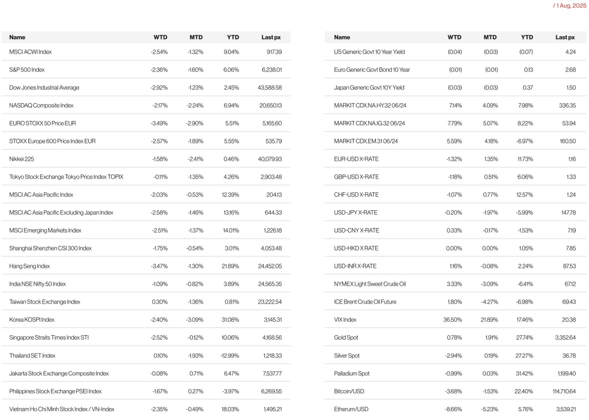 DXY USD Index rose 1.53% to end the week at 99.14, short dollar positions reversed following the US-EU trade agreement announced last week. Market perceived the agreement as more negative for Europe. The Fed maintained its policy rate, in line with expectations. Fed Chair Powell characterized the labor market as solid and at full employment. US Macro data turned negative with non-farm payroll, ISM manufacturing and Michigan consumer sentiment all below consensus. US Q2 GDP was solid, but the outperformance is driven by positive trade balance as import collapsed. Core PCE inflation came in above consensus though. After the non-farm payroll last friday, USD fell to 98.81 after touching a high of 100.25 intra-week.