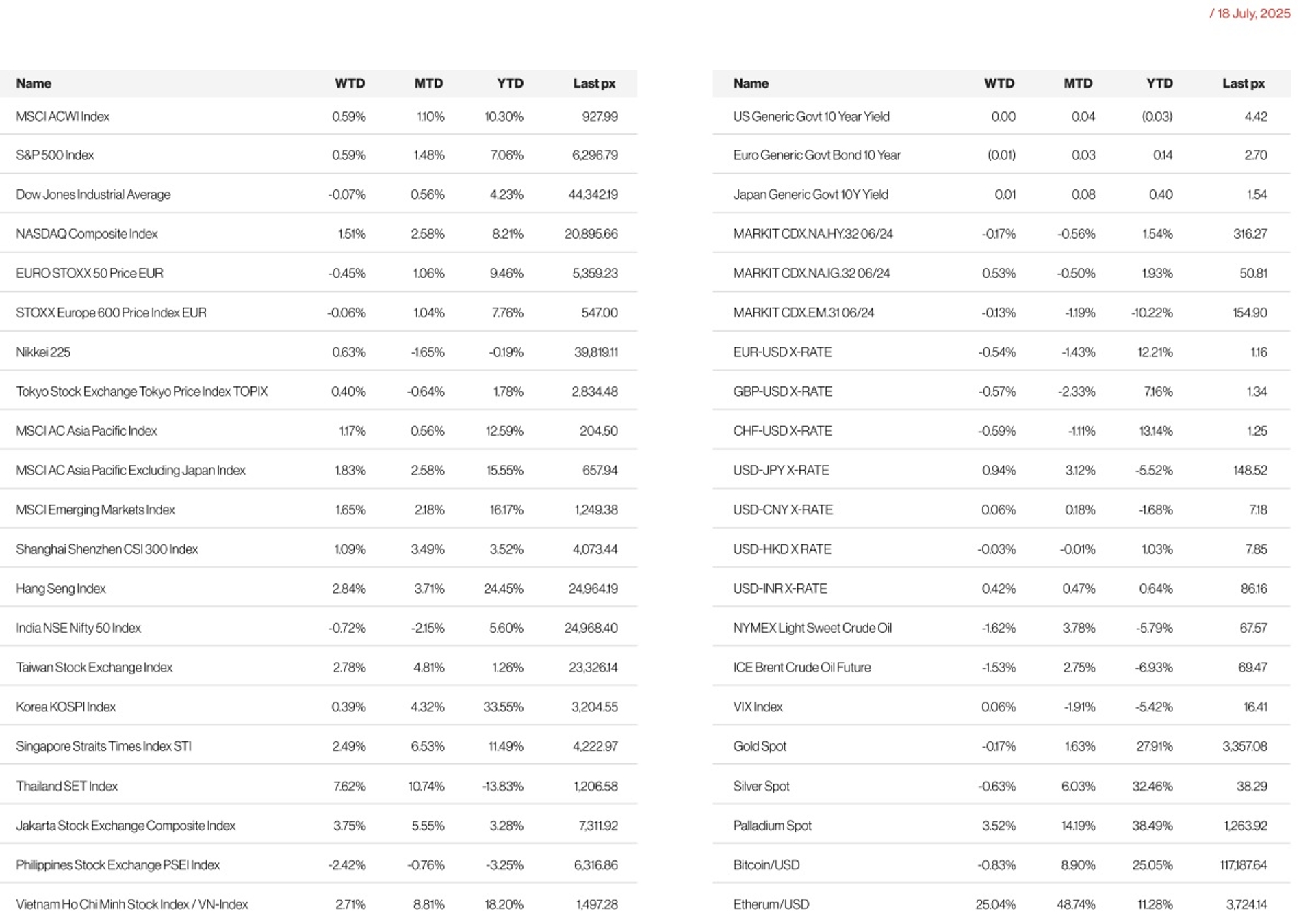 Trade letters from the US continue to get mailed out, April 2nd has become July 9th which has now become August 1st for an ever increasing list of countries. Asian Markets closed the week higher. MSCI Asia ex Japan was up 1.83%. Thailand’s SET index continues to gain with the index higher by 7.62% last week. Thailand however remains the worst performing market year to date still down almost 14% from the start of the year. India and Philippines were the two negative markets, down 0.72% and 2.42% respectively.